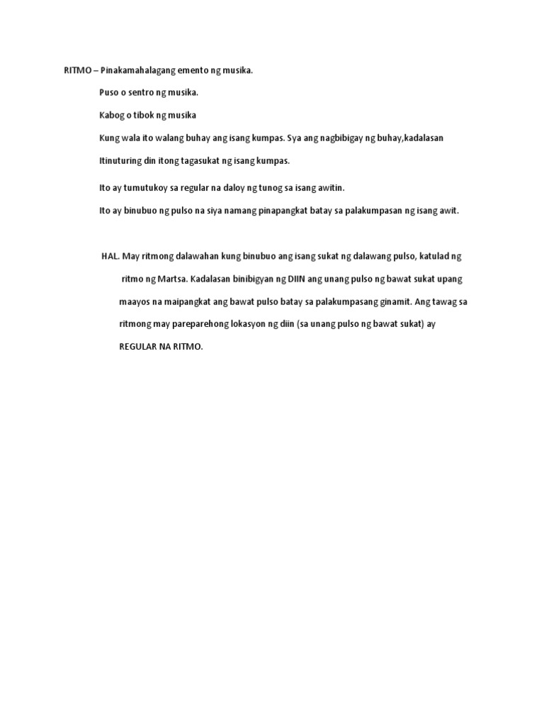02022021 Ang mga elemento ritmo dinamika himig pagkakaisa kulay ng tono texture anyo at teksto ay bumubuo ng wika ng musika. Kabog o tibok ng musikaang RITMO kumbaga ba kung wala ito walang buhay ang isang kumpas. 07072011 ang RITMO ay puso o sentro ng musika.